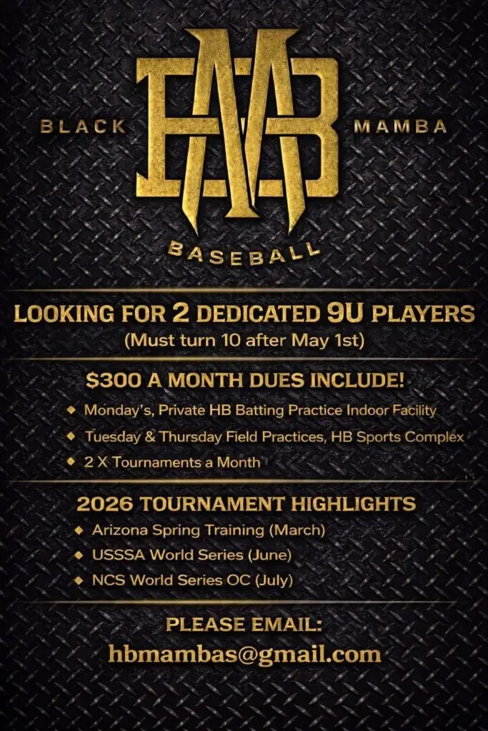 BLACK MAMBA BASEBALL 9U SEEKS 2 PLAYERS April 17, 2026 hotrosters PLAYERS WANTED, TRYOUTS Comments Off on BLACK MAMBA BASEBALL 9U SEEKS 2 PLAYERS 9UBLACK MAMBAHUNTINGTON BEACHTRYOUTTRYOUTS