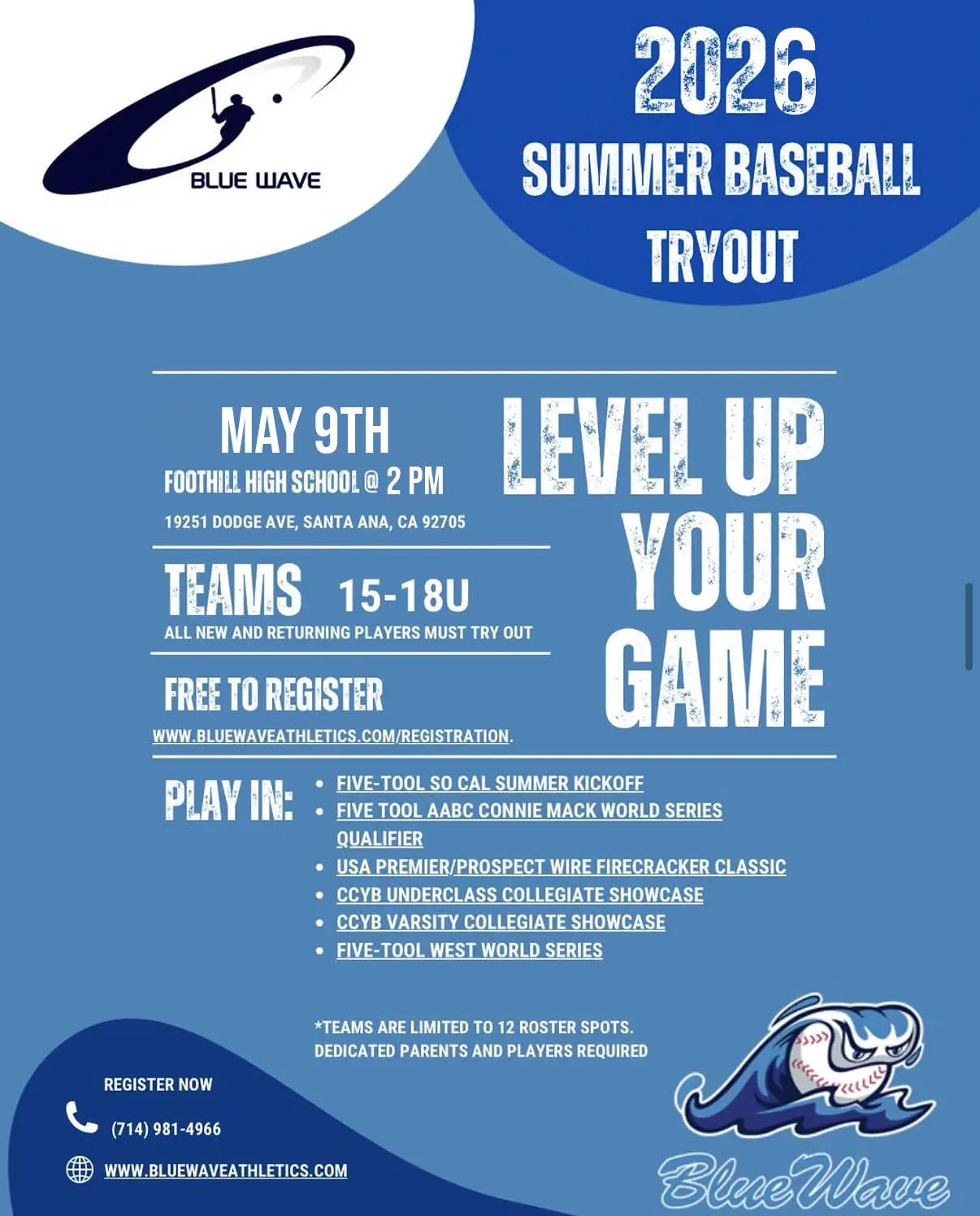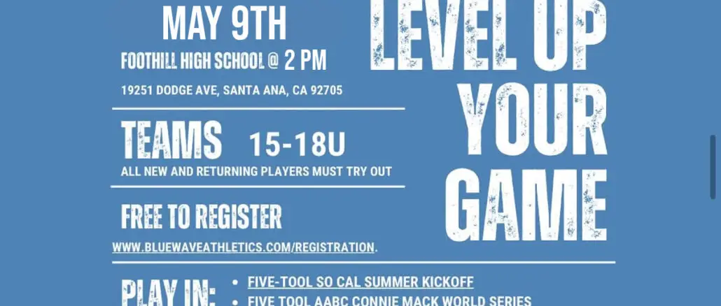BLUE WAVE 15U-18U SUMMER TEAMS TRYOUTS SET FOR MAY 9 @ FOOTHILL HS April 17, 2026 hotrosters TRYOUTS Comments Off on BLUE WAVE 15U-18U SUMMER TEAMS TRYOUTS SET FOR MAY 9 @ FOOTHILL HS 15U16U17U18UORANGE COUNTYSHOWCASE TEAMTRYOUTTRYOUTS