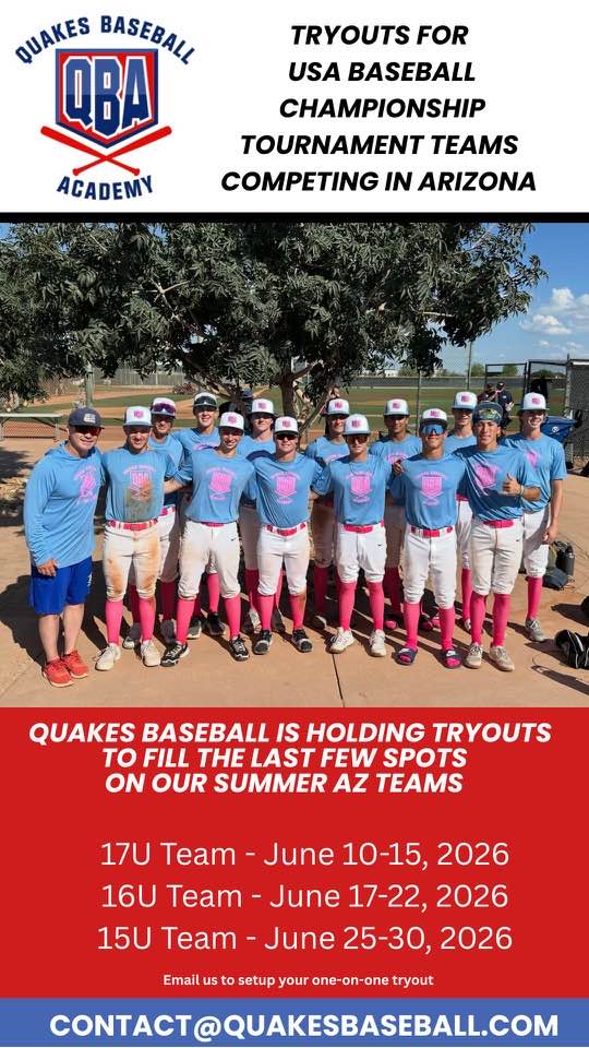 Tryout Now for Quakes’ USA Baseball Teams April 5, 2026 hotrosters TRYOUTS Comments Off on Tryout Now for Quakes’ USA Baseball Teams 15U16U17ULAKE FORESTORANGE COUNTYQUAKES BASEBALL ACADEMYTRYOUTTRYOUTSUSA BASEBALL